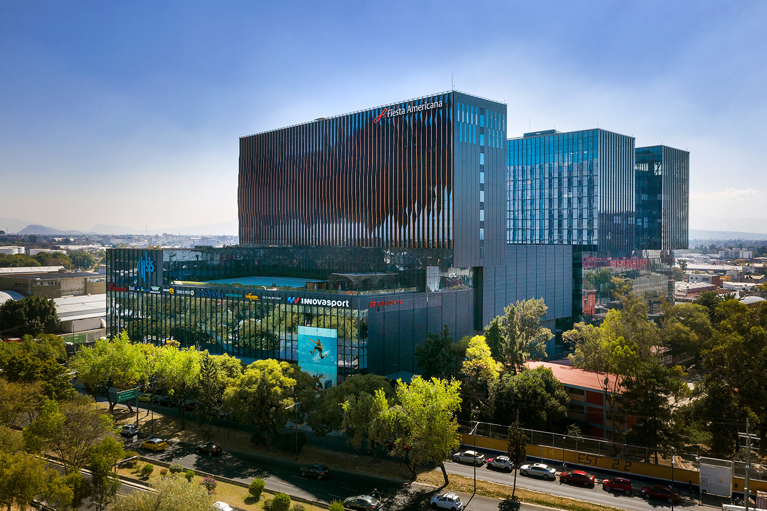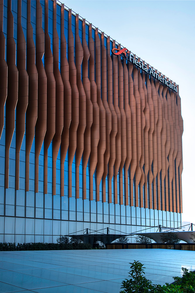 Diseño icónico con paneles cobrizos que reinterpretan el relieve del Valle de México.