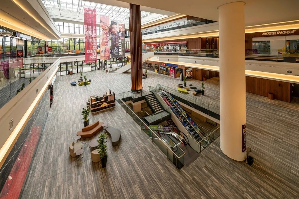 Centro Comercial de tres niveles con cubierta translúcida para un ambiente abierto y luminoso.